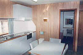 Above left is a photo of the modern two bedroom Cabin, showing the fully equipped kitchen and master bedroom just off to the right. The photo on the right looks through the kitchen and into the large and modern bathroom with glass shower cabinet. Behind the closed door is the second bedroom.