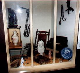 Above is a fascinating project whereby the Museum has recreated a street scene as it would have been in the 1850's. There are 16 reduced size reproductions of shops which were in business during Beechworth's heyday. They include, coaching office, medical hall, dancing salon, ironmongery, drapery, bazaar, watchmaker and jeweller and newsagent. The shops are all properly signwritten, and the window displays are as they were then. On the right you can see one window display, showing firearms and powder holders on the wall, a musical instrument, an old wooden rocking chair, some plates and vases, and a gramophone. This is an excellent display for both schoolchildren and historians.