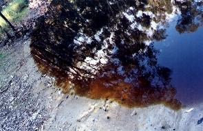 The above photos show the cyanide dam. You can see quite clearly in the top photo that the banks are grey, and the water on the edge is a coppery brown, a similar colour to cyanide. The reflection of the sky makes the rest of the water appear blue. The first two of the other three photo's show the beauty of the lake in the forest, with the colour of the water creating in the reflection, a more brilliant colour than that of the original forest and sky. The Cyanide Dam acts like the "magic mirror on the wall", and makes the relection look much better than the original. It is well worth a trip to see this phenomenom. The last photo shows some of the sandy soil that encourages the grass shrubs and grass trees to grow in this area.