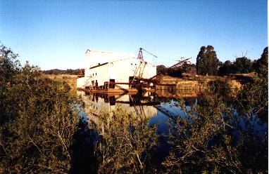 1 Bucket Ladder 2 Bucket ladder moved by elaborate set of pulleys and cables 3 A 160 horse power winch to raise and lower the bucket ladder. 4 Small jib crane (with lattce work) used to remove and replace buckets. 5 Original motor was 300 horse power. Used to move the bucket chain. 6 Large rotary screen. 7 Various jigs (agitators). 8 Course gravel and stones were caught in the rotary screen, (6), passed into the lower semi circular stone chute(8), and discharged from the stern. 9 Poor grade material was ejected via the upper semi circular chute. 10 The waste material from the primary jigs was discharged as a slurry into open troughs or launders running down each side of the dredge and protruding from the stern. 11 Fine waste from the jigs was pumped through a long pipe suspended from the stern on a lattice frame, and discharged on top of the course gravel and stones. 12 This small tin shed was the "Dunny" or toilet. 13 Overhead travelling crane, used to lift heavy equipment on and off the dredge. 14 The control room. 15 The elaborate system of electrical switches and meters which controlled the various motors. 16 This area has mechanical levers which controlled winches, which in turn controlled all movement of the dredge.