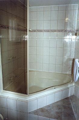 Above you can see the luxurious spa bath, which can be used as a shower, a bath or a relaxing spa bath. The spa is located in the ensuite adjoining the double bedroom. Floor Plan of the Spa Villas 36 feet x 15 feet, or 11 metres x 4.5 metres, with an 8 foot or 2.4 metre wide verandah.