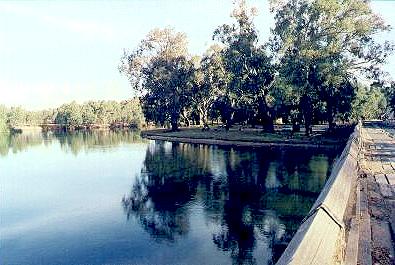 The magnificent view of the Black Swan Annabranch of the Murray River from the old Bridge overlooking the Lions swimming area and childrens playground and picnic area. The picturesque gardens and picnic rotunda set in front of the Howlong Hovell Tree. A favourite fishing spot at Lions Park. you can see the grassy bank built to fish from, and you can also see the two rivers, the Murray River and the Black Swan Annabranch join just where you can cast your line.