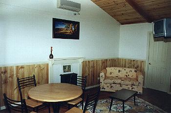 Above you can see the living area, with the reverse cycle air conditioner, the ornamental open fire place, ceiling fans, remote controlled television and comfortable lounges.