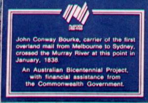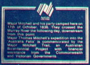 A Plaque to commemorate Major Mitchell who with his expedition crossed the Murray here in October 1836. Also another plaque commemorating the first Overland Mail from Melbourne to Sydney crossed here in January, 1838.