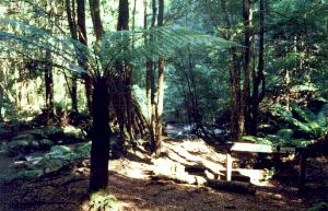 Along the walk to the Meeting of the Waters, which is 600 metres from the car park, the rain forest looks like the photo above left. The meeting of the Waters is where the two rivers, the Taggerty River  and Whitehouse Creek combine. The walk takes you to a small peninsular where you have the Taggerty River on your left, the Whitehouse Creek on your right, and the meeting place straight ahead. A wooden signpost informs you of this occasion, picture above right.