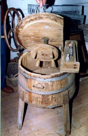 Above is another very ingeious washing machine of the very early 19th Century. The rocket shaped machine is loaded by opening the nose cone, and placing in the washing and the water. Upon shutting the nose cone you take hold of the handle between the nose cone and the wringer, and by pulling and pushing this backwards and forwards, the "Space Ship" rocks and the water is thrown about the washing. When completed the washing is squeezed through the wringer to get rid of excess water.